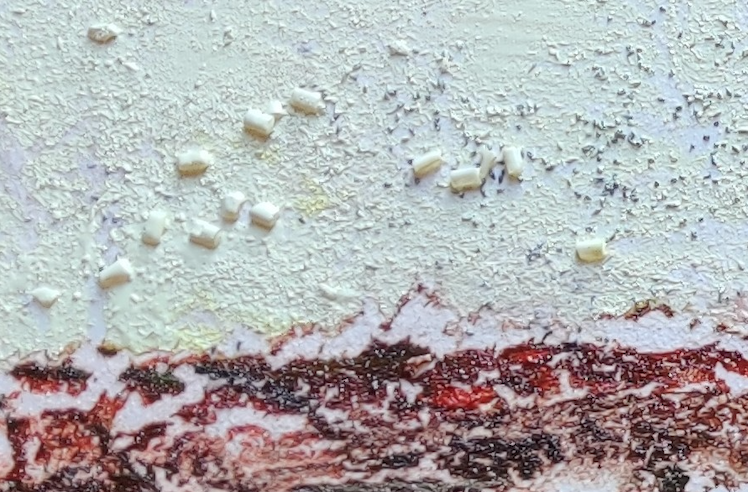 Para el relieve, como base principal usé mármol molido, carbono de silíceo, otros minerales y parafina. El acabado final está conseguido con barniz brillo.