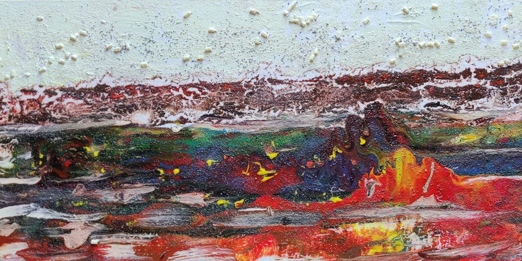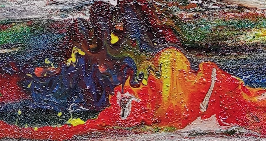En esta ocasión he utilizado esmaltes sintéticos con diferentes rojos puros y mezclas de amarillos, blancos y negros para conseguir la intensidad del fuego.