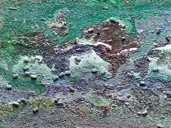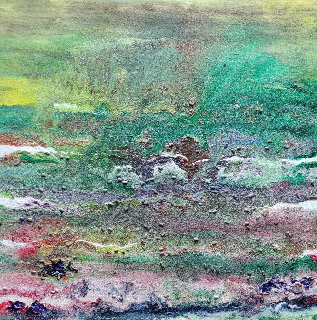 He mezclado pinturas acrílicas y sintéticas, las he sometido a altas temperaturas para conseguir el rojo bermellón y fuego a modo de cráter volcánico.