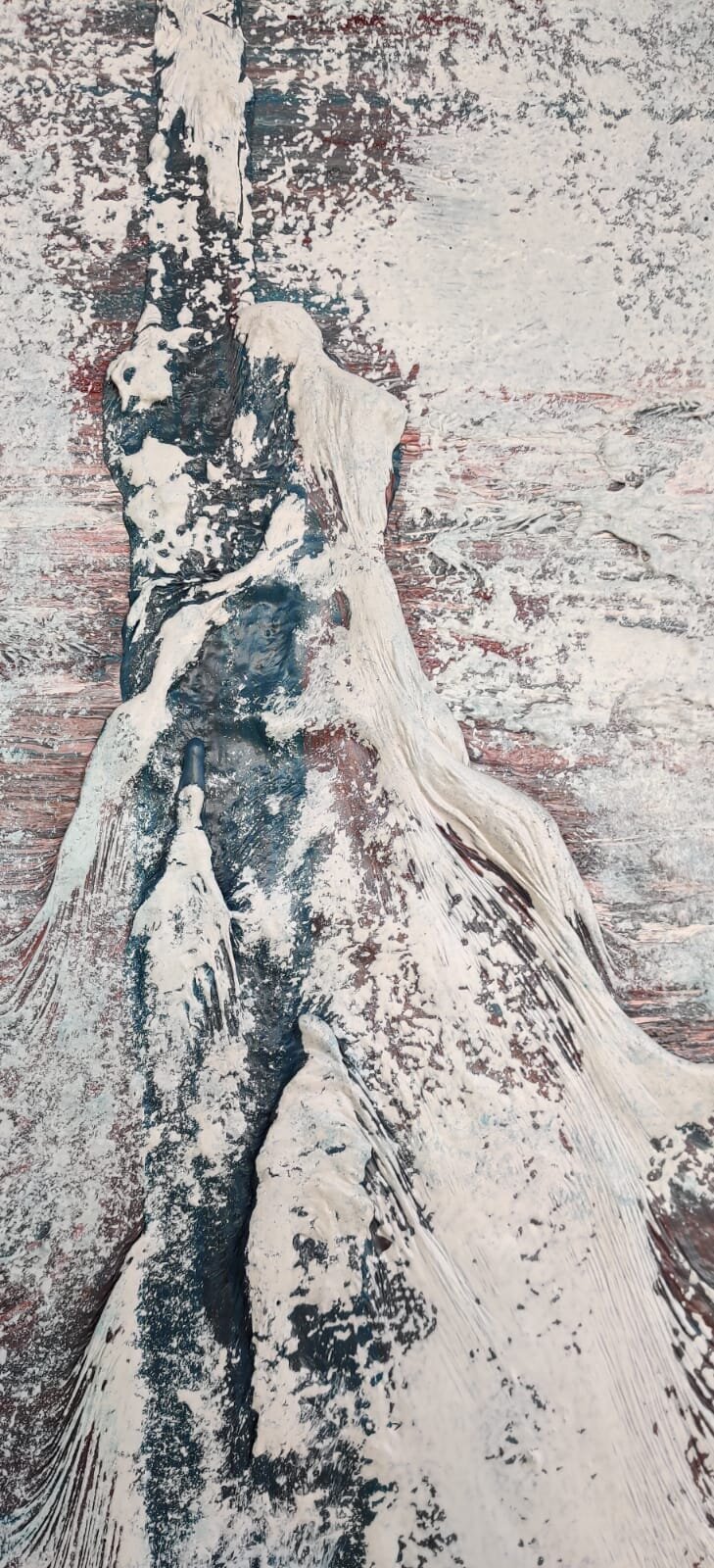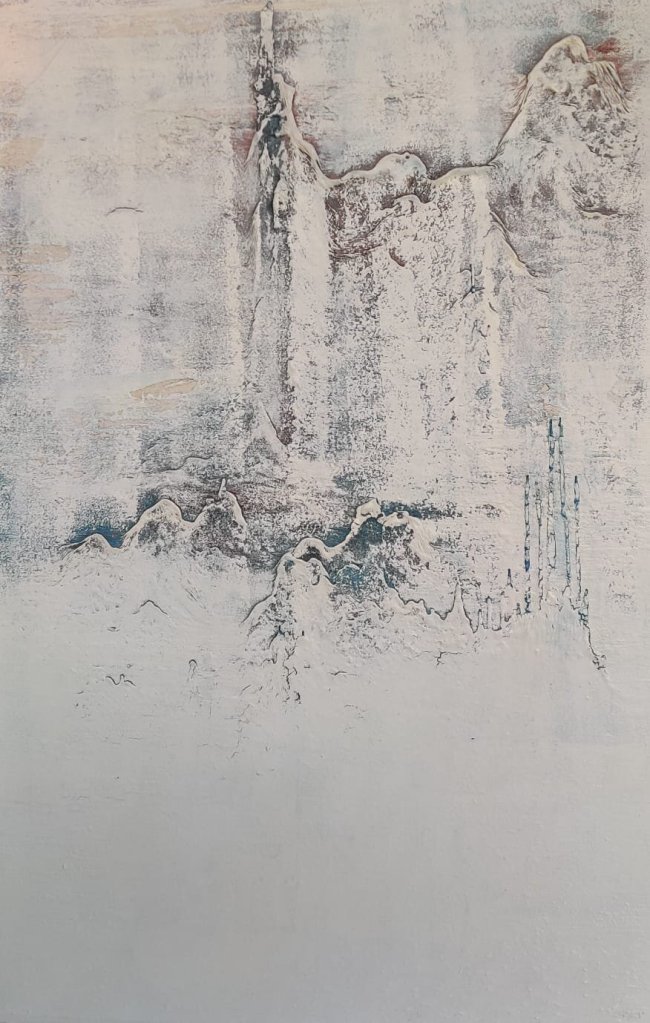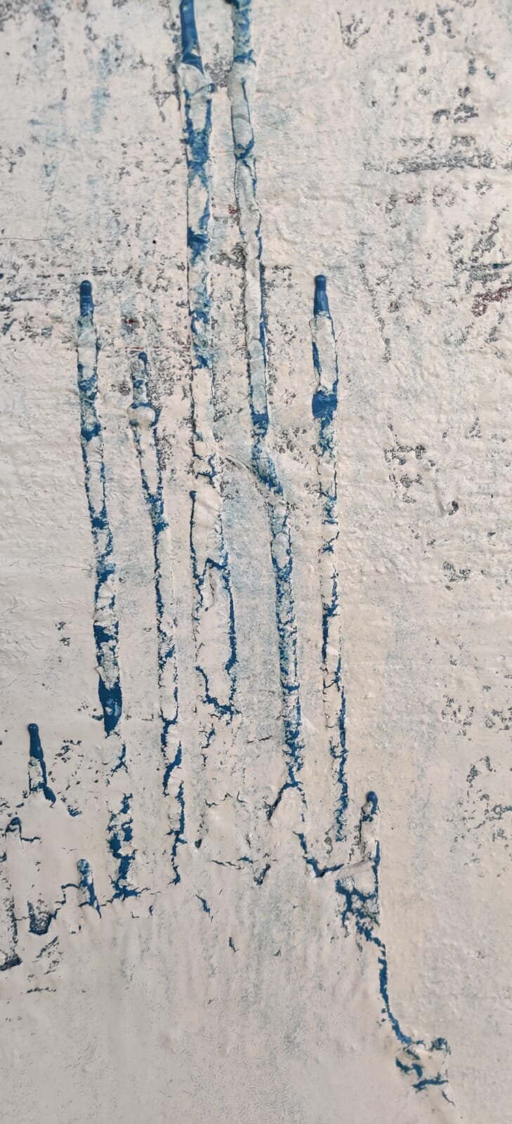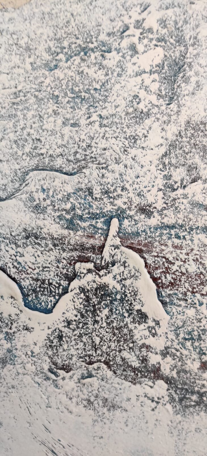 Relieve con varias capas gruesas de imprimación sintética de grasa y resina, a su vez están sometidas a secado lento de varios meses. Los diferentes blancos, azules, rojos conforman esta obra, con un acabado con barniz transparente aplicado con spray.